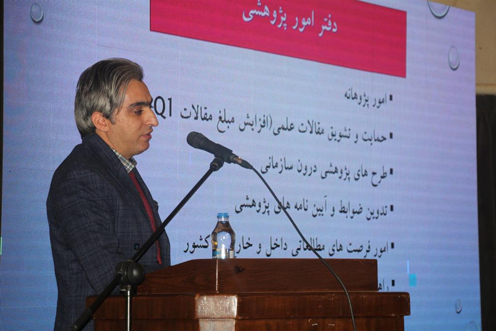پس از آن، خانم دکتر نیلوفر ملک، معاون پژوهش و فناوری دانشگاه، گزارشی از برنامه‌های چهارساله این معاونت ارائه کرد و نشان داد که حمایت از پژوهش‌های دانشگاهی در قالب پژوهانه، تقویت ارتباط با جامعه و صنعت، ایجاد فرصت‌های مطالعاتی در محیط‌های واقعی، تشویق به انتشار مقالات علمی، توسعه آزمایشگاه مرکزی و حمایت از مرکز رشد تخصصی هنر، همگی در راستای ارتقای جایگاه دانشگاه طراحی شده‌اند. او همچنین بر تفویض اختیار به معاونان پژوهشی دانشکده‌ها تأکید کرد تا فرآیندهای پژوهشی با سرعت و انعطاف بیشتری پیش برود.