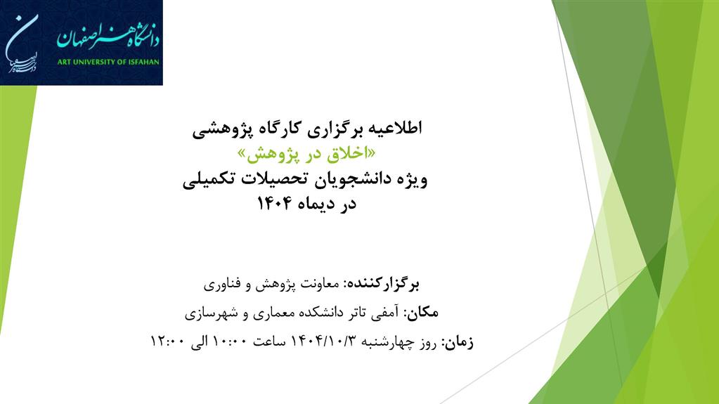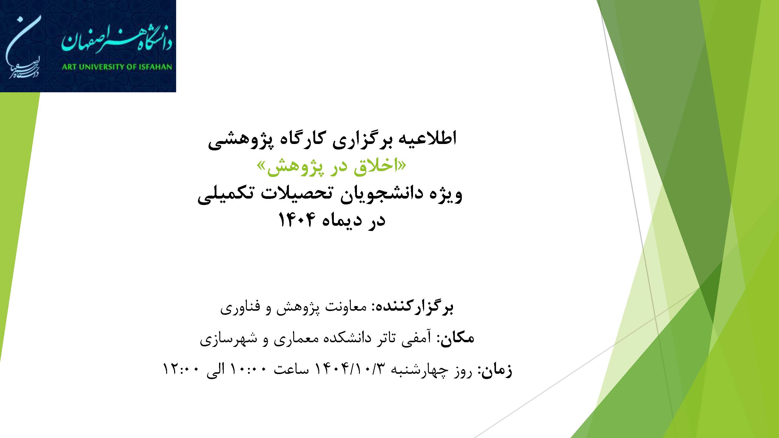 کارگاه پژوهشی با عنوان «اخلاق در پژوهش» در دیماه 1404 ویژه دانشجویان تحصیلات تکمیلی(ارشد و دکتری) توسط جناب آقای دکتر مهرداد چشمه سهرابی، عضو محترم هیأت علمی گروه علم اطلاعات و دانش شناسی دانشگاه اصفهان، روز چهارشنبه مورخ  3/ 10/  1404 ساعت 10:00 الی 12:00 در آمفی تاتر دانشکده معماری و شهرسازی برگزار خواهد شد.